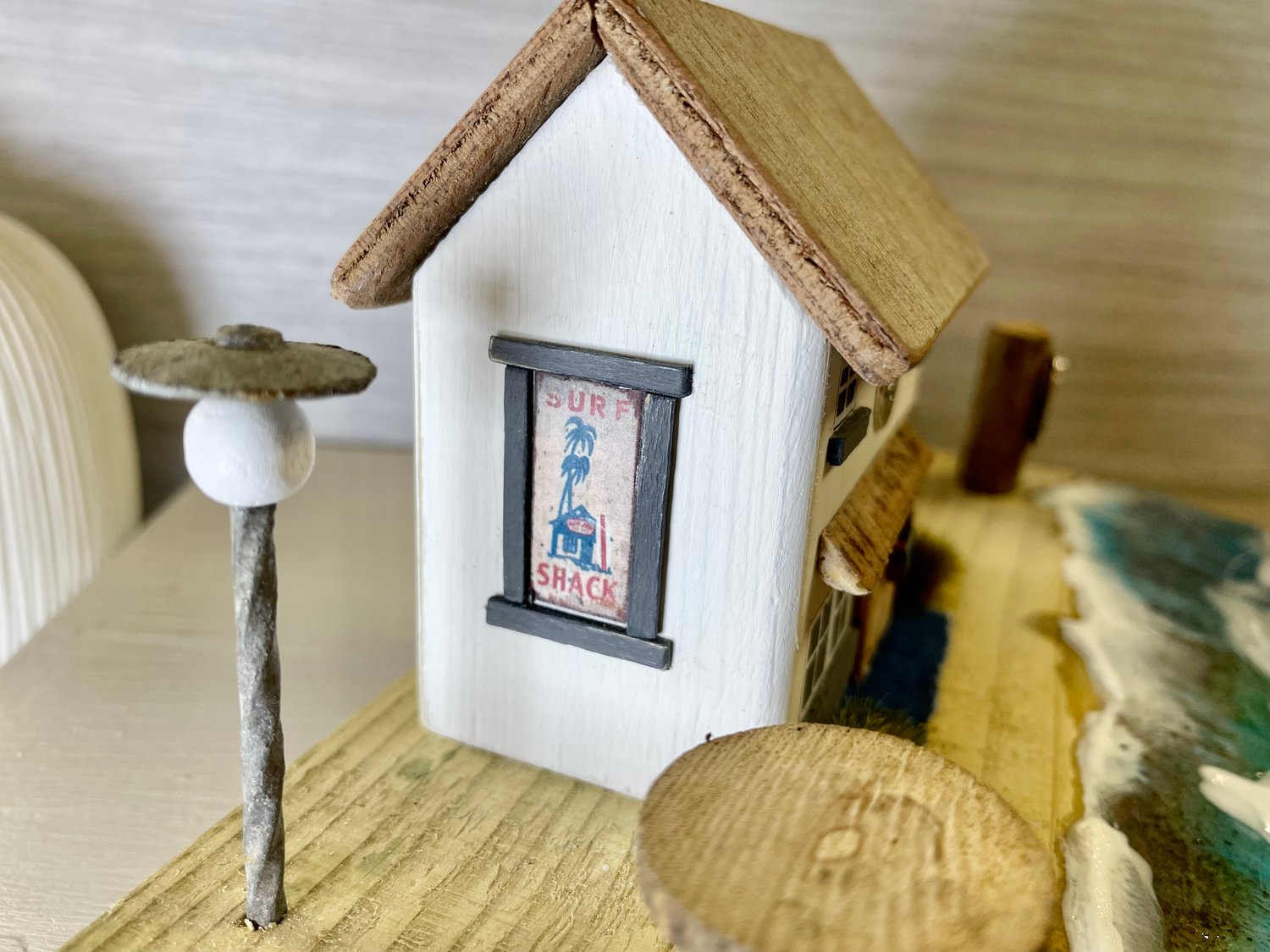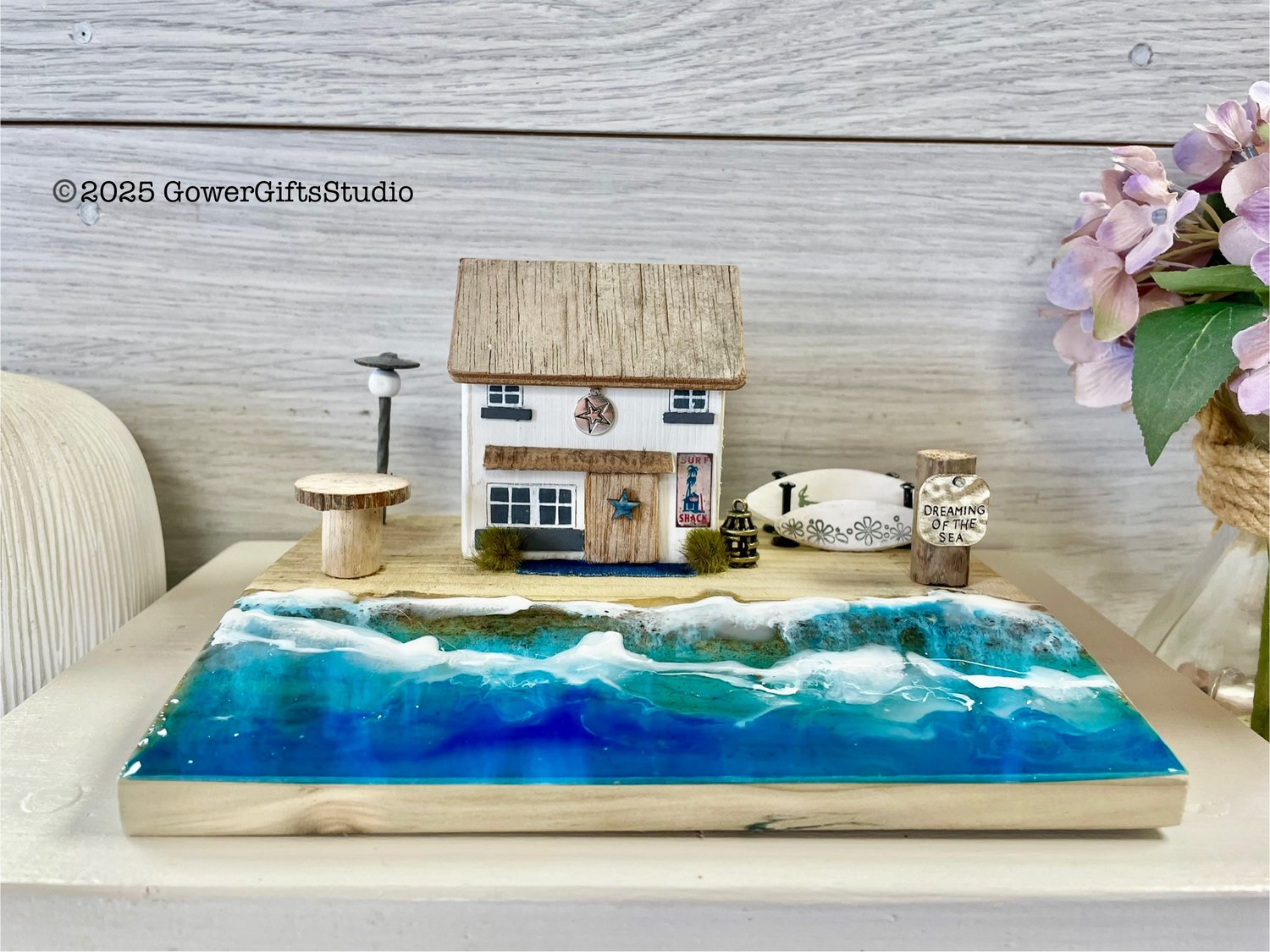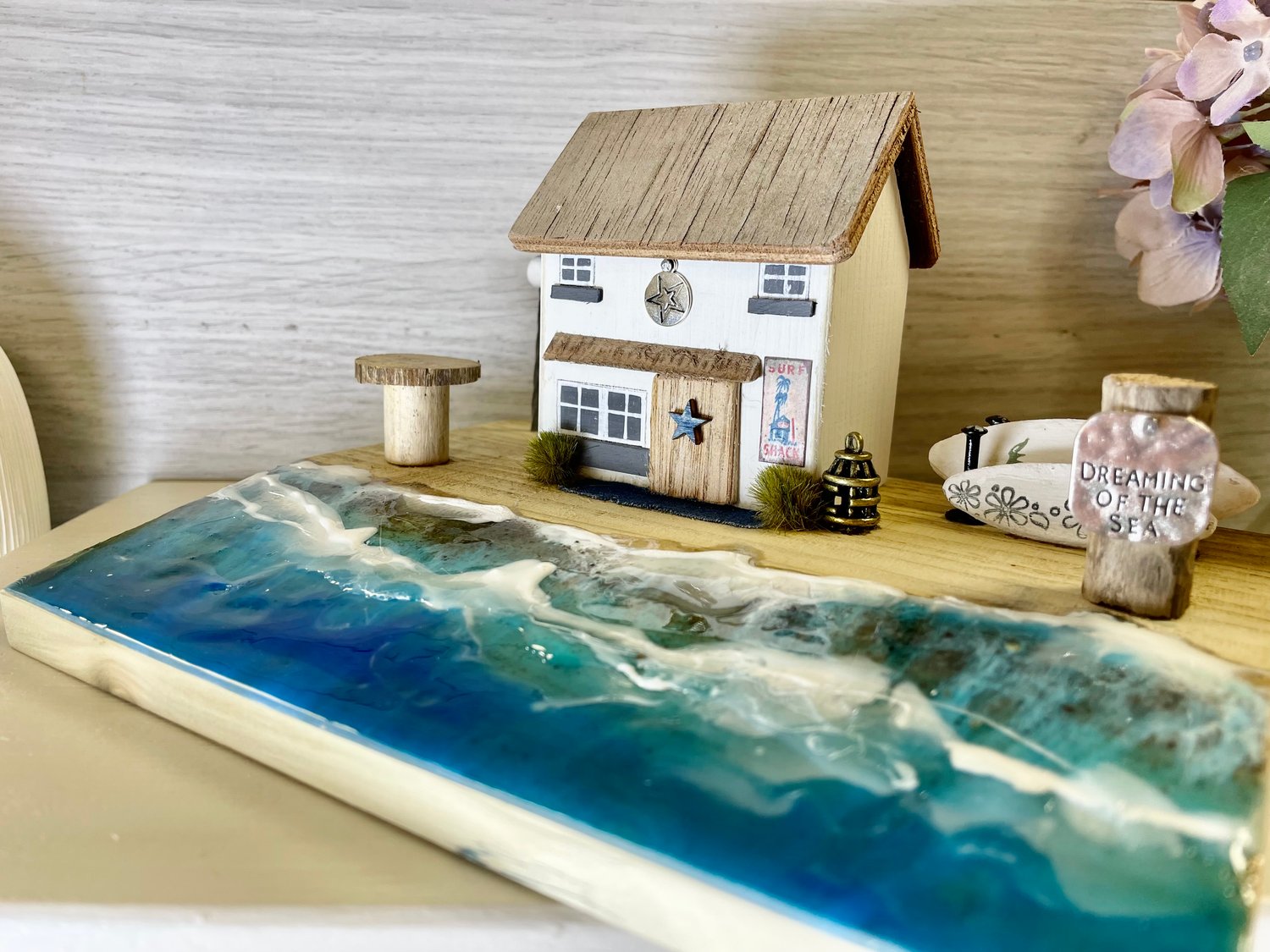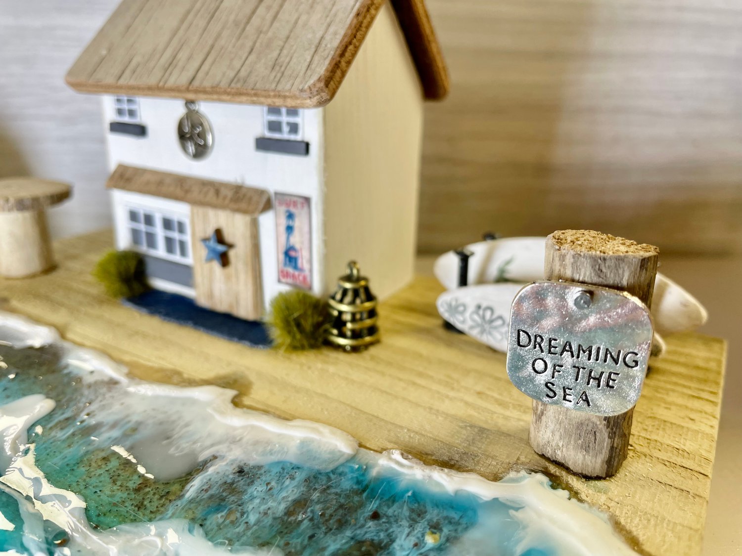 Dive into a world of waves, sun and surf. Captured in our handmade surf shop scene featuring fine coastal details including surfboards, coastal signs, lobster pot and gentle waves frozen in crystal - clear resin.